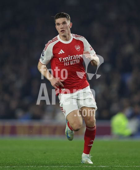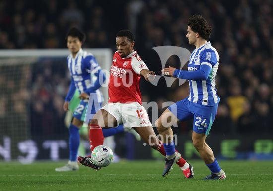 2898269 BRIGHTON, INGLATERRA, 4 DE MARCO: Jurrien Timber, do Arsenal, disputa a bola com Ferdi Kadioglu, do Brighton & Hove Albion, durante a partida entre Brighton & Hove Albion FC e Arsenal FC pela Premier League, no AMEX Community Stadium, em Brighton, Inglaterra, em 4 de marco. (Daniel Weir/SPP)