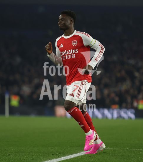 2898240 BRIGHTON, INGLATERRA, 4 DE MARCO: GOL 1-0, Bukayo Saka, do Arsenal, comemora apos marcar o gol que colocou o Arsenal em vantagem por 1 a 0 durante a partida entre Brighton & Hove Albion FC e Arsenal FC pela Premier League, no AMEX Community Stadium, em Brighton, Inglaterra, em 4 de marco. (Daniel Weir/ SPP)