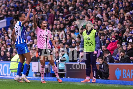 2844155 Maelys Mpome (5 Brighton & Hove Albion) e Asmita Ale (12 Leicester City) disputam um arremesso lateral durante a partida da Barclays Women's Super League entre Brighton & Hove Albion Women e Leicester City Women, no Broadfields Stadium, em Crawley, Inglaterra. (Neil Holmes/SPP)