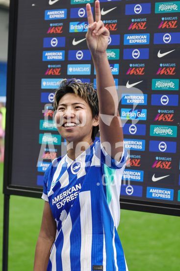 2844159 Kiko Seike (11 Brighton & Hove Albion) sauda a torcida durante a partida da Barclays Women's Super League entre Brighton & Hove Albion Women e Leicester City Women, no Broadfields Stadium, em Crawley, Inglaterra. (Neil Holmes/SPP)
