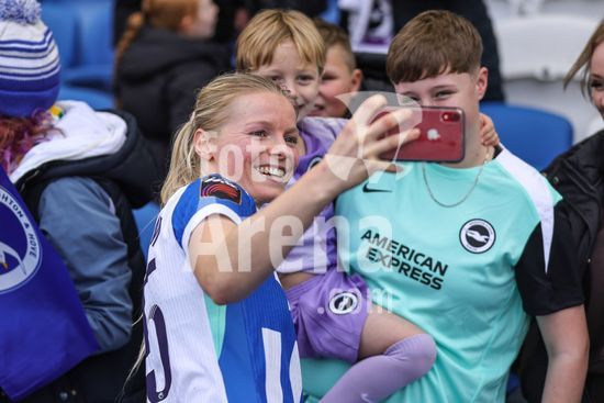 2844161 Nadine Noordam (15 Brighton & Hove Albion) posa para uma foto com um fa durante a partida da Barclays Women's Super League entre Brighton & Hove Albion Women e Leicester City Women, no Broadfields Stadium, em Crawley, Inglaterra. (Neil Holmes/SPP)