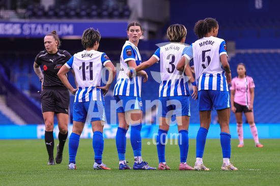 2844162 Charlie Rule (33 Brighton & Hove Albion) organizando a barreira durante a partida da Barclays Women's Super League entre Brighton & Hove Albion Women e Leicester City Women, no Broadfields Stadium, em Crawley, Inglaterra. (Neil Holmes/SPP)