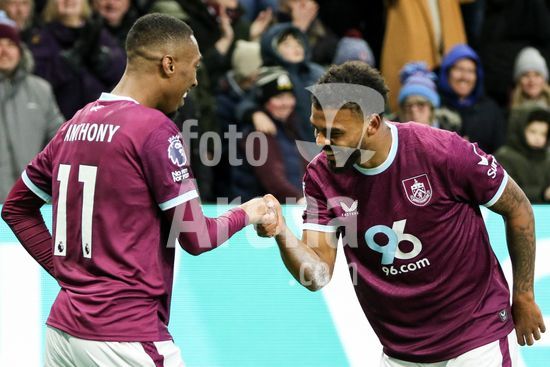 2872977 Lyle Foster (9 Burnley) comemora seu gol com Jaidon Anthony (11 Burnley) durante a partida da Premier League entre Burnley e Tottenham Hotspur em Turf Moor em Burnley, Inglaterra, em 24 de janeiro de 2026. (Sean Chandler / SPP)