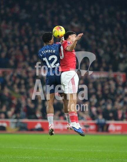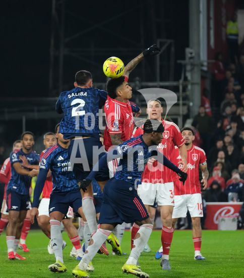 2869367 William Saliba, do Arsenal, e Igor Jesus, do Nottingham Forest, em acao durante a partida de futebol da Premier League entre Nottingham Forest e Arsenal, no City Ground, em Nottingham. (Paul Bonser/Sports Press Photo / SPP)