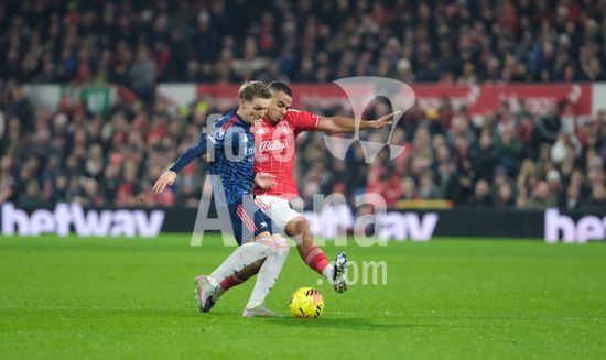 2869379 Noni Madueke, do Arsenal, e Elliot Anderson, do Nottingham Forest, em acao durante a partida de futebol da Premier League entre Nottingham Forest e Arsenal, no City Ground, em Nottingham. (Paul Bonser/Sports Press Photo / SPP)