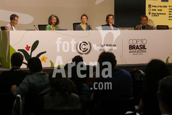 os dirigentes do Greenpeace Carolina Pasquali, Jasper Inventor, An Lambrechts e Rebecca Newsom concedem entrevista coletiva na tarde desta sexta-feira na Blue Zone da COP 30 em Belém no Pará. O Greenpeace solicita que o resultado da COP inclua um plano histórico capaz de frear a destruição das florestas, garantir a transição energética longe dos combustíveis fósseis e fortalecer o financiamento para adaptação climática.