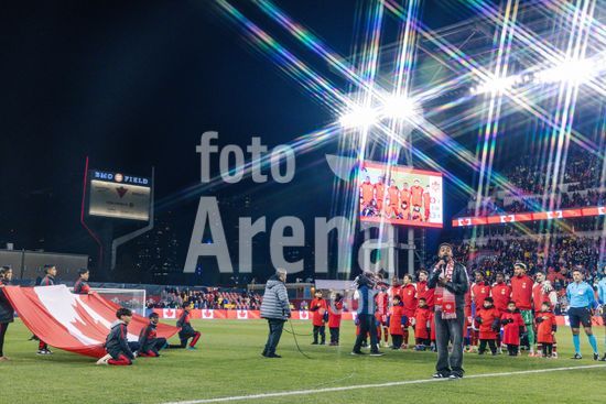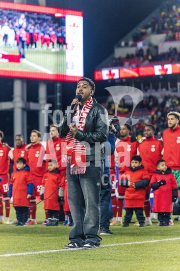 2842782 Toronto, Canada, 13 de novembro de 2025. A selecao canadense canta o hino nacional antes do amistoso internacional masculino entre Canada e Equador no BMO Field, em Toronto, Canada (SOMENTE PARA USO EDITORIAL). (Curtis Wong/SPP)