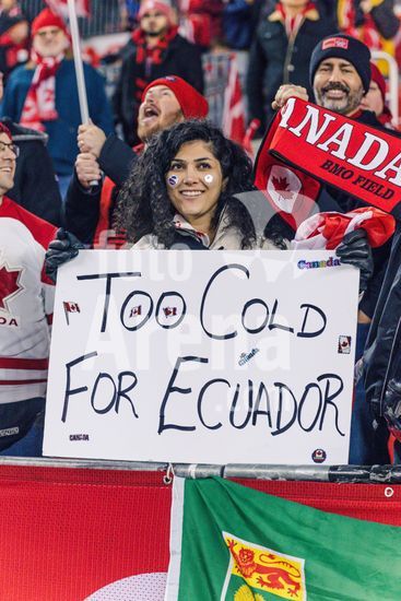 2842789 Toronto, Canada, 13 de novembro de 2025. Torcedores exibindo cartazes durante o amistoso internacional masculino entre Canada e Equador no BMO Field, em Toronto, Canada (APENAS PARA USO EDITORIAL). (Curtis Wong/SPP)