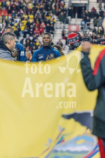 2842816 Toronto, Canada, 13 de novembro de 2025. Moises Caicedo (23, Equador) cantando o hino nacional antes do amistoso internacional masculino entre Canada e Equador no BMO Field, em Toronto, Canada (SOMENTE PARA USO EDITORIAL). (Curtis Wong/SPP)