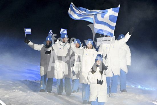 2880170 Predazzo, Italia, 6 de fevereiro de 2026. A Grecia entra na cerimonia de abertura dos Jogos Olimpicos de Inverno de 2026 em Predazzo, Italia. (Foto de Igor Kupljenik/Sports Press Photo) (Igor Kupljenik / SPP)