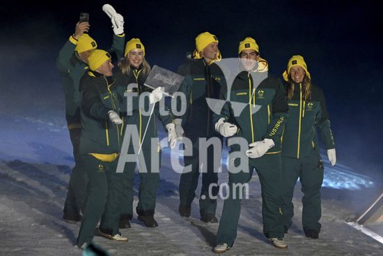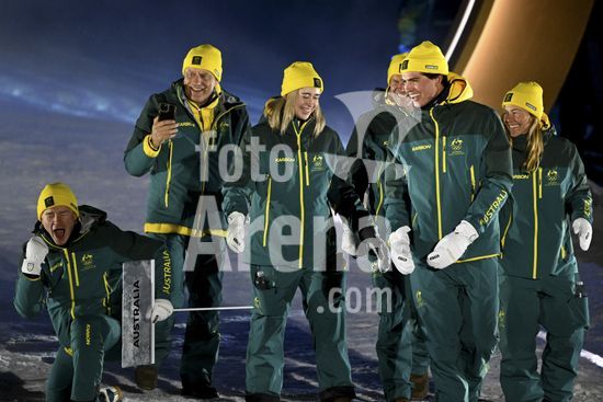 2880147 Predazzo, Italia, 6 de fevereiro de 2026. A Australia entra na cerimonia de abertura dos Jogos Olimpicos de Inverno de 2026 em Predazzo, Italia. (Foto de Igor Kupljenik/Sports Press Photo) (Igor Kupljenik / SPP)