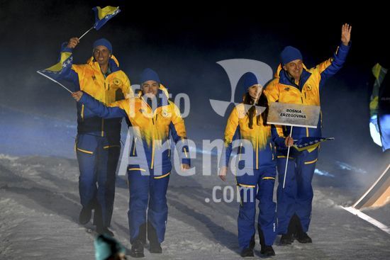 2880148 Predazzo, Italia, 6 de fevereiro de 2026. A Bosnia e Herzegovina entra na cerimonia de abertura dos Jogos Olimpicos de Inverno de 2026 em Predazzo, Italia. (Foto de Igor Kupljenik/Sports Press Photo) (Igor Kupljenik / SPP)