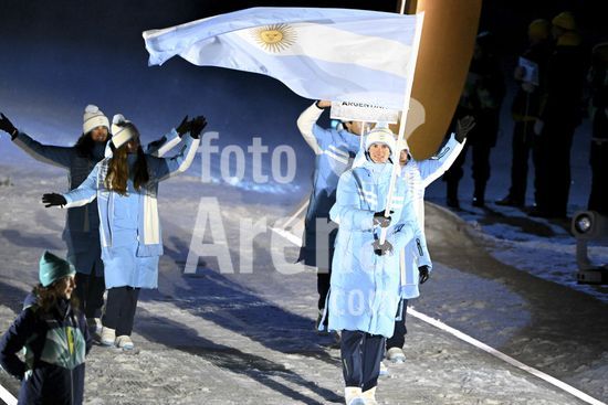 2880149 Predazzo, Italia, 6 de fevereiro de 2026. A Argentina entra na cerimonia de abertura dos Jogos Olimpicos de Inverno de 2026 em Predazzo, Italia. (Foto de Igor Kupljenik/Sports Press Photo) (Igor Kupljenik / SPP)