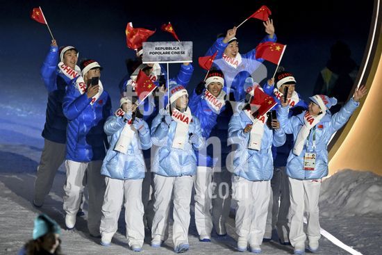 2880153 Predazzo, Italia, 6 de fevereiro de 2026. A China entra na cerimonia de abertura dos Jogos Olimpicos de Inverno de 2026 em Predazzo, Italia. (Foto de Igor Kupljenik/Sports Press Photo) (Igor Kupljenik / SPP)