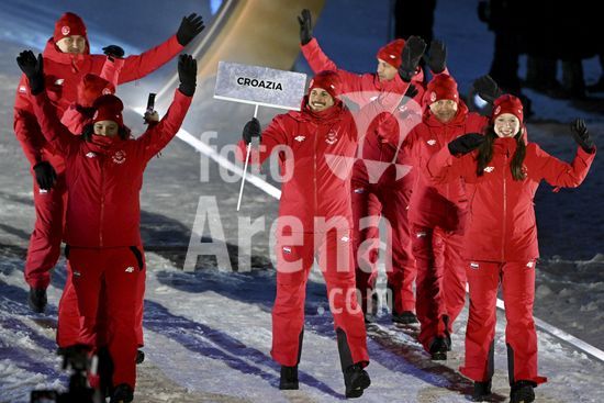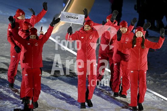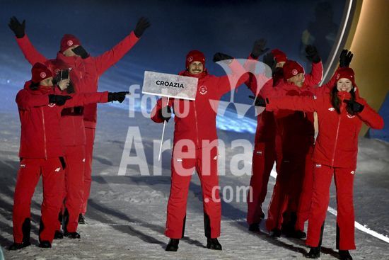 2880155 Predazzo, Italia, 6 de fevereiro de 2026. A Croacia entra na cerimonia de abertura dos Jogos Olimpicos de Inverno de 2026 em Predazzo, Italia. (Foto de Igor Kupljenik/Sports Press Photo) (Igor Kupljenik / SPP)