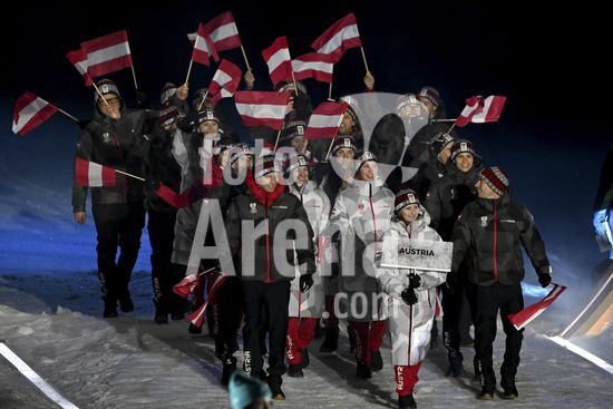 2880158 Predazzo, Italia, 6 de fevereiro de 2026. A Austria entra na cerimonia de abertura dos Jogos Olimpicos de Inverno de 2026 em Predazzo, Italia. (Foto de Igor Kupljenik/Sports Press Photo) (Igor Kupljenik / SPP)