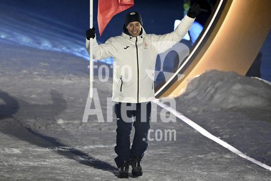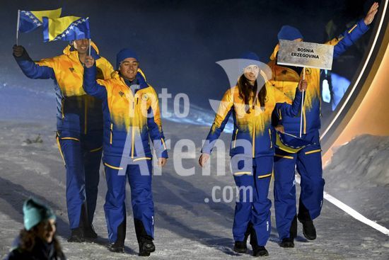 2880159 Predazzo, Italia, 6 de fevereiro de 2026. A Bosnia e Herzegovina entra na cerimonia de abertura dos Jogos Olimpicos de Inverno de 2026 em Predazzo, Italia. (Foto de Igor Kupljenik/Sports Press Photo) (Igor Kupljenik / SPP)