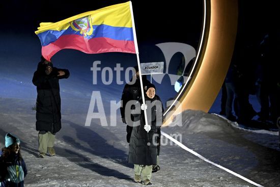 2880165 Predazzo, Italia, 6 de fevereiro de 2026. O Equador entra na cerimonia de abertura dos Jogos Olimpicos de Inverno de 2026 em Predazzo, Italia. (Foto de Igor Kupljenik/Sports Press Photo) (Igor Kupljenik / SPP)
