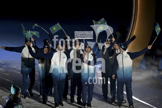 2880169 Predazzo, Italia, 6 de fevereiro de 2026. O Cazaquistao entra na cerimonia de abertura dos Jogos Olimpicos de Inverno de 2026 em Predazzo, Italia. (Foto de Igor Kupljenik/Sports Press Photo) (Igor Kupljenik / SPP)