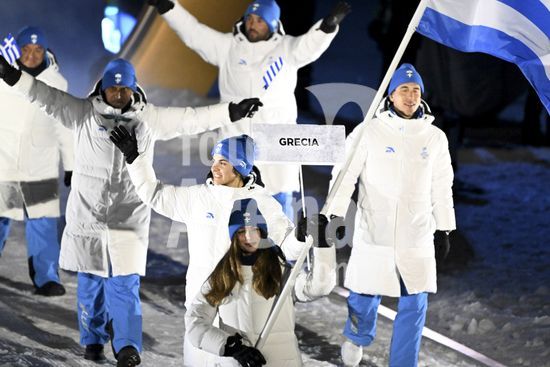 2880145 Predazzo, Italia, 6 de fevereiro de 2026. A Grecia entra na cerimonia de abertura dos Jogos Olimpicos de Inverno de 2026 em Predazzo, Italia. (Foto de Igor Kupljenik/Sports Press Photo) (Igor Kupljenik / SPP)