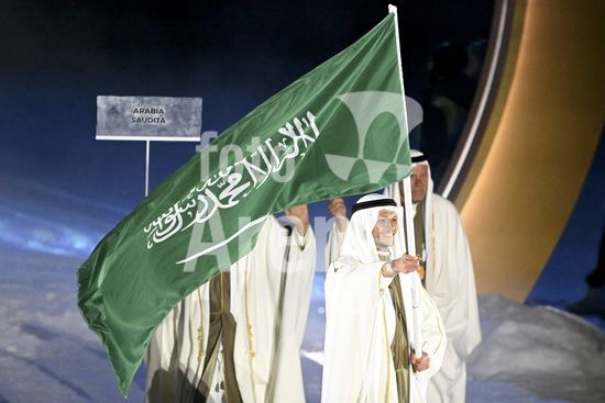 2880171 Predazzo, Italia, 6 de fevereiro de 2026. A equipe da Arabia Saudita entra na cerimonia de abertura dos Jogos Olimpicos de Inverno de 2026 em Predazzo, Italia. (Foto de Igor Kupljenik/Sports Press Photo) (Igor Kupljenik / SPP)