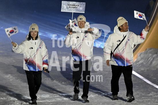 2880174 Predazzo, Italia, 6 de fevereiro de 2026. A Coreia do Sul entra na cerimonia de abertura dos Jogos Olimpicos de Inverno de 2026 em Predazzo, Italia. (Foto de Igor Kupljenik/Sports Press Photo) (Igor Kupljenik / SPP)