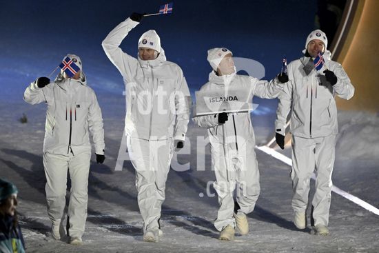 2880177 Predazzo, Italia, 6 de fevereiro de 2026. A Islandia entra na cerimonia de abertura dos Jogos Olimpicos de Inverno de 2026 em Predazzo, Italia. (Foto de Igor Kupljenik/Sports Press Photo) (Igor Kupljenik / SPP)