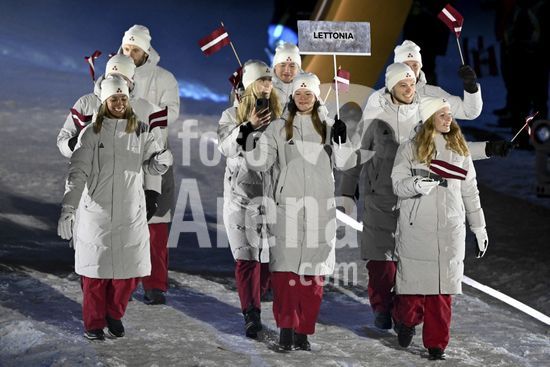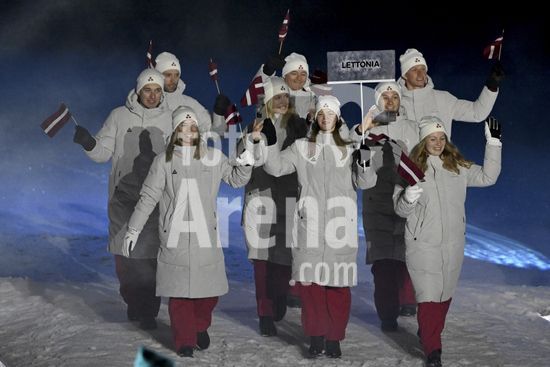 2880206 Predazzo, Italia, 6 de fevereiro de 2026. A Letonia entra na cerimonia de abertura dos Jogos Olimpicos de Inverno de 2026 em Predazzo, Italia. (Foto de Igor Kupljenik/Sports Press Photo) (Igor Kupljenik / SPP)