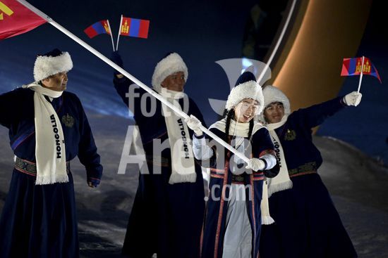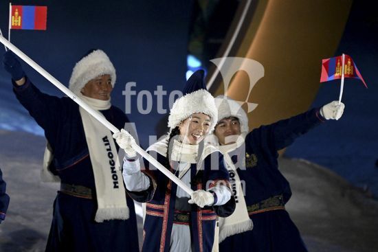 2880182 Predazzo, Italia, 6 de fevereiro de 2026. A Mongolia entra na cerimonia de abertura dos Jogos Olimpicos de Inverno de 2026 em Predazzo, Italia. (Foto de Igor Kupljenik/Sports Press Photo) (Igor Kupljenik / SPP)