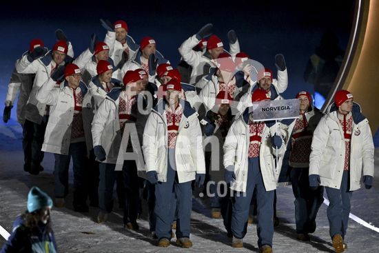 2880185 Predazzo, Italia, 6 de fevereiro de 2026. A Noruega entra na cerimonia de abertura dos Jogos Olimpicos de Inverno de 2026 em Predazzo, Italia. (Foto de Igor Kupljenik/Sports Press Photo) (Igor Kupljenik / SPP)