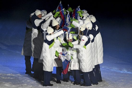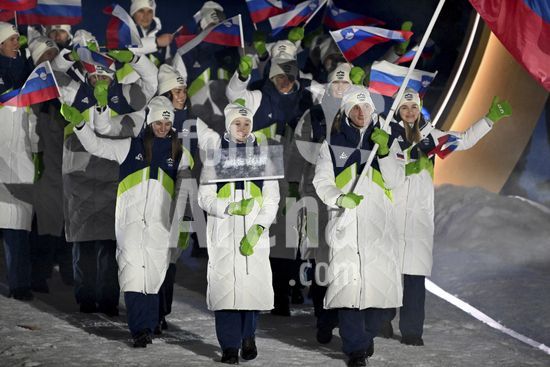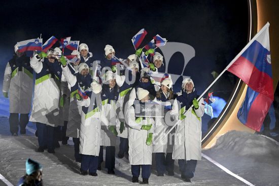 2880198 Predazzo, Italia, 6 de fevereiro de 2026. A Eslovenia entra na cerimonia de abertura dos Jogos Olimpicos de Inverno de 2026 em Predazzo, Italia. (Foto de Igor Kupljenik/Sports Press Photo) (Igor Kupljenik / SPP)