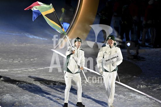 2880189 Predazzo, Italia, 6 de fevereiro de 2026. A Africa do Sul entra na cerimonia de abertura dos Jogos Olimpicos de Inverno de 2026 em Predazzo, Italia. (Foto de Igor Kupljenik/Sports Press Photo) (Igor Kupljenik / SPP)