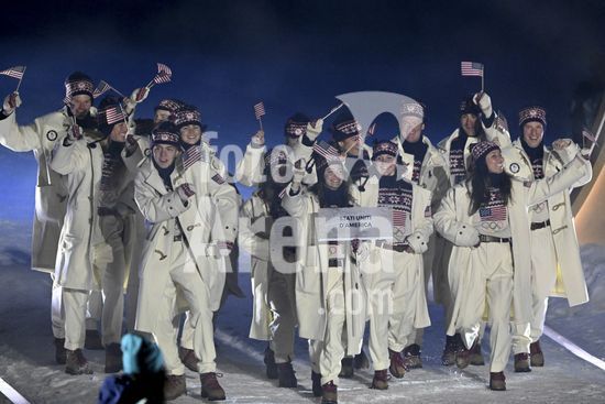 2880193 Predazzo, Italia, 6 de fevereiro de 2026. Os Estados Unidos da America entram na cerimonia de abertura dos Jogos Olimpicos de Inverno de 2026 em Predazzo, Italia. (Foto de Igor Kupljenik/Sports Press Photo) (Igor Kupljenik / SPP)