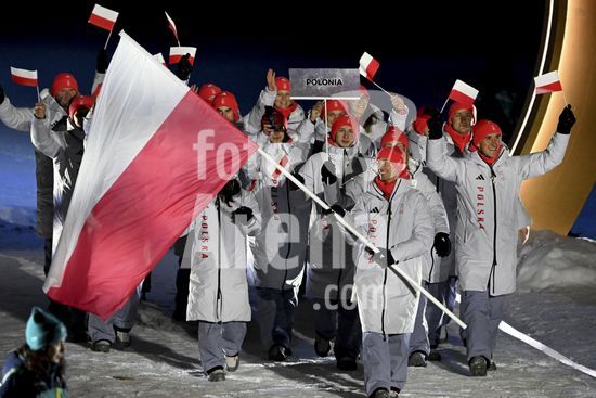 2880195 Predazzo, Italia, 6 de fevereiro de 2026. A Polonia entra na cerimonia de abertura dos Jogos Olimpicos de Inverno de 2026 em Predazzo, Italia. (Foto de Igor Kupljenik/Sports Press Photo) (Igor Kupljenik / SPP)