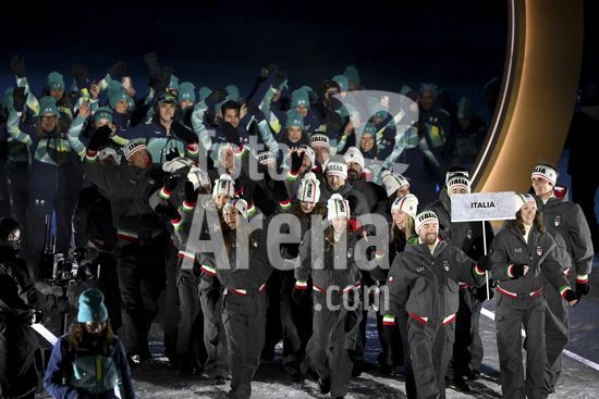 2880196 Predazzo, Italia, 6 de fevereiro de 2026. A Italia entra na cerimonia de abertura dos Jogos Olimpicos de Inverno de 2026 em Predazzo, Italia. (Foto de Igor Kupljenik/Sports Press Photo) (Igor Kupljenik / SPP)