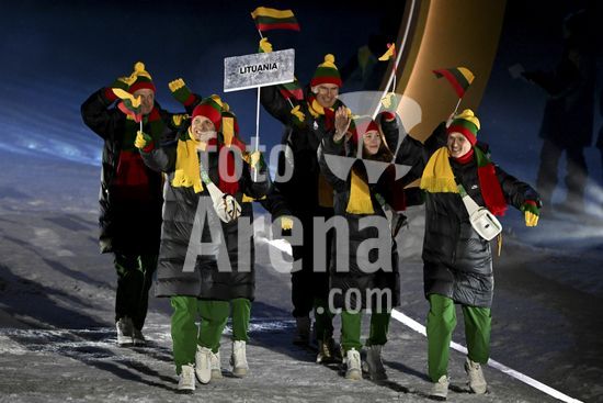 2880207 Predazzo, Italia, 6 de fevereiro de 2026. A Lituania entra na cerimonia de abertura dos Jogos Olimpicos de Inverno de 2026 em Predazzo, Italia. (Foto de Igor Kupljenik/Sports Press Photo) (Igor Kupljenik / SPP)