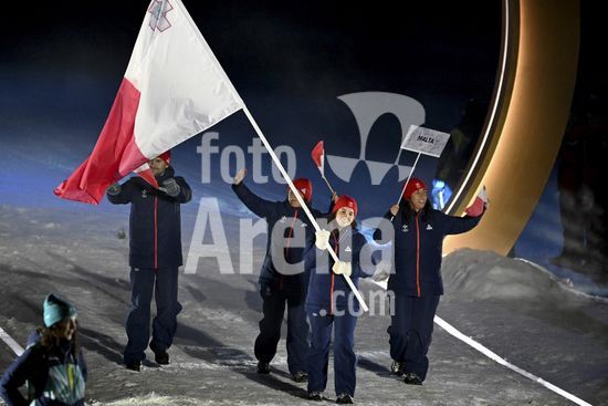 2880208 Predazzo, Italia, 6 de fevereiro de 2026. Malta entra na cerimonia de abertura dos Jogos Olimpicos de Inverno de 2026 em Predazzo, Italia. (Foto de Igor Kupljenik/Sports Press Photo) (Igor Kupljenik / SPP)