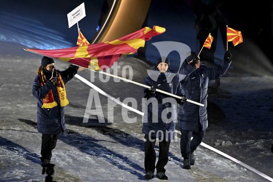 2880209 Predazzo, Italia, 6 de fevereiro de 2026. A Macedonia do Norte entra na cerimonia de abertura dos Jogos Olimpicos de Inverno de 2026 em Predazzo, Italia. (Foto de Igor Kupljenik/Sports Press Photo) (Igor Kupljenik / SPP)