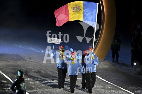 2880211 Predazzo, Italia, 6 de fevereiro de 2026. A Moldavia entra na cerimonia de abertura dos Jogos Olimpicos de Inverno de 2026 em Predazzo, Italia. (Foto de Igor Kupljenik/Sports Press Photo) (Igor Kupljenik / SPP)