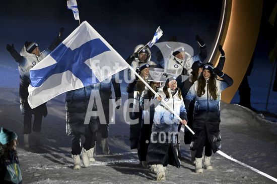 2880212 Predazzo, Italia, 6 de fevereiro de 2026. A Finlandia entra na cerimonia de abertura dos Jogos Olimpicos de Inverno de 2026 em Predazzo, Italia. (Foto de Igor Kupljenik/Sports Press Photo) (Igor Kupljenik / SPP)