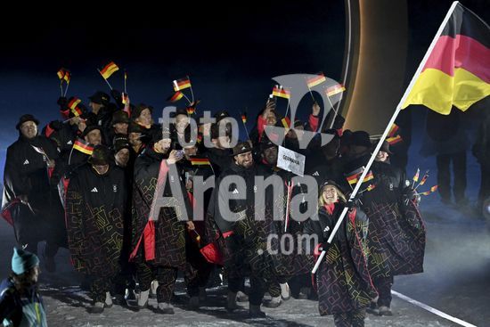 2880213 Predazzo, Italia, 6 de fevereiro de 2026. A Alemanha entra na cerimonia de abertura dos Jogos Olimpicos de Inverno de 2026 em Predazzo, Italia. (Foto de Igor Kupljenik/Sports Press Photo) (Igor Kupljenik / SPP)