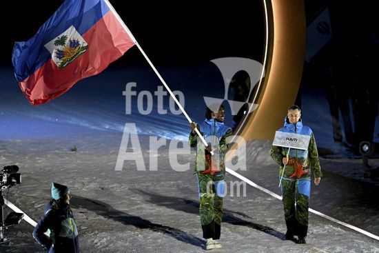 2880217 Predazzo, Italia, 6 de fevereiro de 2026. O Haiti entra na cerimonia de abertura dos Jogos Olimpicos de Inverno de 2026 em Predazzo, Italia. (Foto de Igor Kupljenik/Sports Press Photo) (Igor Kupljenik / SPP)