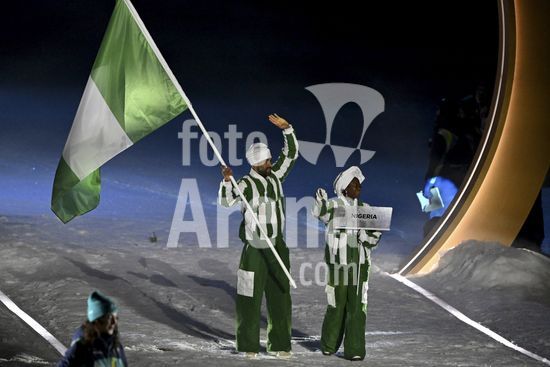 2880219 Predazzo, Italia, 6 de fevereiro de 2026. A Nigeria entra na cerimonia de abertura dos Jogos Olimpicos de Inverno de 2026 em Predazzo, Italia. (Foto de Igor Kupljenik/Sports Press Photo) (Igor Kupljenik / SPP)
