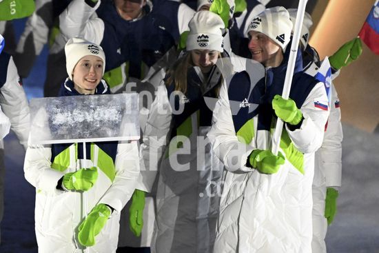 2880220 Predazzo, Italia, 6 de fevereiro de 2026. A Eslovenia entra na cerimonia de abertura dos Jogos Olimpicos de Inverno de 2026 em Predazzo, Italia. (Foto de Igor Kupljenik/Sports Press Photo) (Igor Kupljenik / SPP)