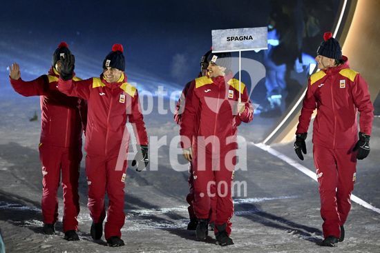 2880221 Predazzo, Italia, 6 de fevereiro de 2026. A Espanha entra na cerimonia de abertura dos Jogos Olimpicos de Inverno de 2026 em Predazzo, Italia. (Foto de Igor Kupljenik/Sports Press Photo) (Igor Kupljenik / SPP)