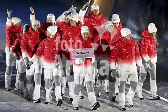 2880222 Predazzo, Italia, 6 de fevereiro de 2026. A Suica entra na cerimonia de abertura dos Jogos Olimpicos de Inverno de 2026 em Predazzo, Italia. (Foto de Igor Kupljenik/Sports Press Photo) (Igor Kupljenik / SPP)