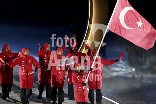 2880224 Predazzo, Italia, 6 de fevereiro de 2026. A Turquia entra na cerimonia de abertura dos Jogos Olimpicos de Inverno de 2026 em Predazzo, Italia. (Foto de Igor Kupljenik/Sports Press Photo) (Igor Kupljenik / SPP)