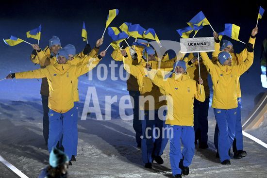 2880225 Predazzo, Italia, 6 de fevereiro de 2026. A Ucrania entra na cerimonia de abertura dos Jogos Olimpicos de Inverno de 2026 em Predazzo, Italia. (Foto de Igor Kupljenik/Sports Press Photo) (Igor Kupljenik / SPP)