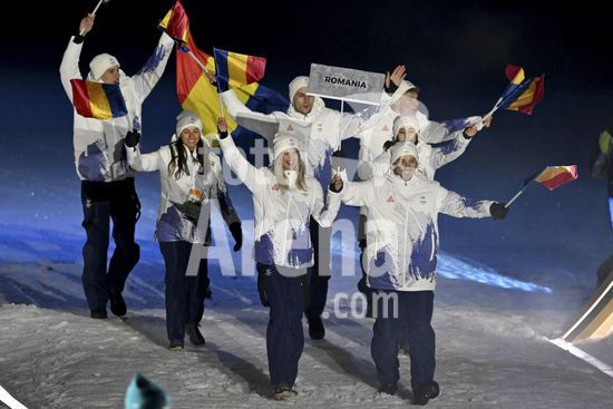 2880227 Predazzo, Italia, 6 de fevereiro de 2026. A Romenia entra na cerimonia de abertura dos Jogos Olimpicos de Inverno de 2026 em Predazzo, Italia. (Foto de Igor Kupljenik/Sports Press Photo) (Igor Kupljenik / SPP)