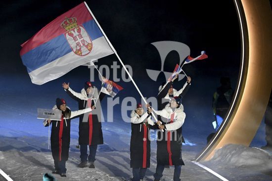 2880229 Predazzo, Italia, 6 de fevereiro de 2026. A Servia entra na cerimonia de abertura dos Jogos Olimpicos de Inverno de 2026 em Predazzo, Italia. (Foto de Igor Kupljenik/Sports Press Photo) (Igor Kupljenik / SPP)